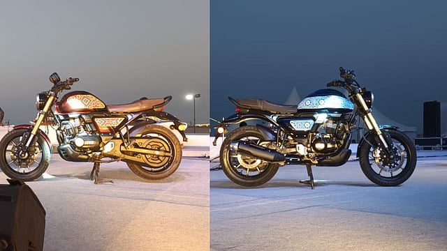 The motorcycles' distinctive paint jobs feature Ajrak print, a traditional hand-block printing technique from Ajrakhpur, Kutch. Known for its intricate geometric designs and vibrant natural dyes, primarily indigo and red, Ajrak print is a significant craft of the region, commonly seen on turbans, shawls, and lungis worn by local communities like the Rabaris and Maldharis.
