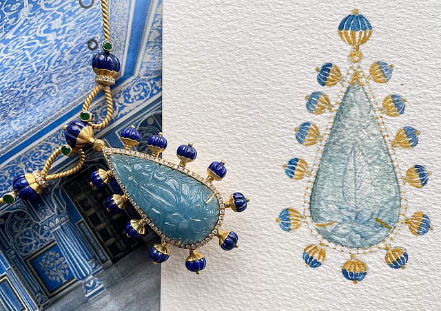 The designer primarily works with hand-carved gemstones and enamelling, using Indian techniques, like meenakari, to craft unique pieces such as reversible necklaces (featuring a rotating pendant with a labradorite and moonstone bead set in 14k or 18k gold), button covers (made from semi-precious gems that are to be clipped over sleeve buttons) and striking ear cuffs (studded with diamonds, citrine, golden topaz, diamonds and moonstones). “All my designs are sketched by hand, and then I determine the gemstones that will work best for the design. Once each sample is designed, we do some tests to ensure that the jewellery is sturdy,” she explains. There are also numerous other statement pieces such as the Leaf Necklace, which is strung with hand-carved pink, green and watermelon tourmalines; and the Gyan Ring, made with a carved melon-hued fluorite stone which is encased in a rotating pink enamel cap. The playful and fun ring also has an internal adjustable band that allows the wearer to change the tightness up to three sizes. Originally from Indore, Akansha takes inspiration from varied sources such as the 400-year-old City Palace in Udaipur, Yves Saint Laurent’s Majorelle Gardens in Morocco and the colours of autumn in London.