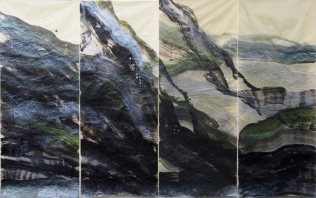 Across the wall, in View from Atlantis, two Ife heads (from the ancient Yoruba city in Nigeria) are stitched into the paper with fluorescent thread; they peer up from a watery expanse.