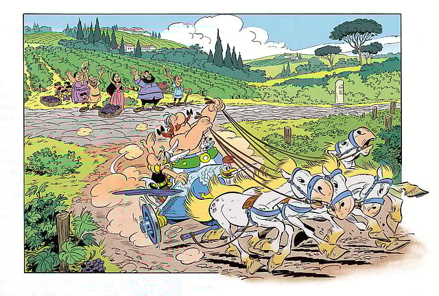 And so, we find Asterix and Obelix playing charioteers, with Dogmatix in tow, walloping Roman centurions and troops of legionnaires, cannonballing alongside the seemly Bretons, the laidback Lusitanians (the laconic Undaduress and his aide Bitovamess), the bullnecked Ligurians, the conniving Cimbri, and the canny Calabrians, among others. They race through the labyrinthine streets of Sena Julia, past Tibur (Tivoli) via Umbria, and the capital Rome, along the Bay of Neapolis (Naples), and onto the foothills of Mount Vesuvius.