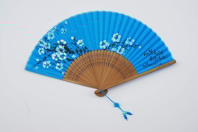 All the elements are painted in five prominent inks, with Korean inscriptions embedded either on the outer borders or in the corners of the fan’s frames.