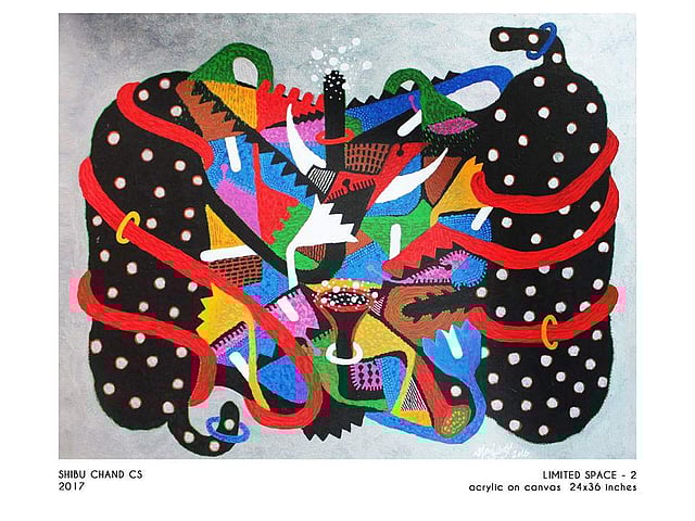 In life, there are common experiences that bind us together. Ranging from global warming to FOMO-driven social media culture, we have several such elements in our life which make us relate to each other. Thiruvananthapuram-based artist Shibhu Chand’s work stems from these experiences and the impact they have on our lives. “For me, it is the lack of space that matters the most. Whether it is living conditions or individual freedom, we’re being restricted by a set of elements that suffocates us, limits us and makes us shrink into ourselves,” begins the government employee turned artist, who is exhibiting his series called Limited Space at Fort Kochi-based Draavidia Art Gallery.