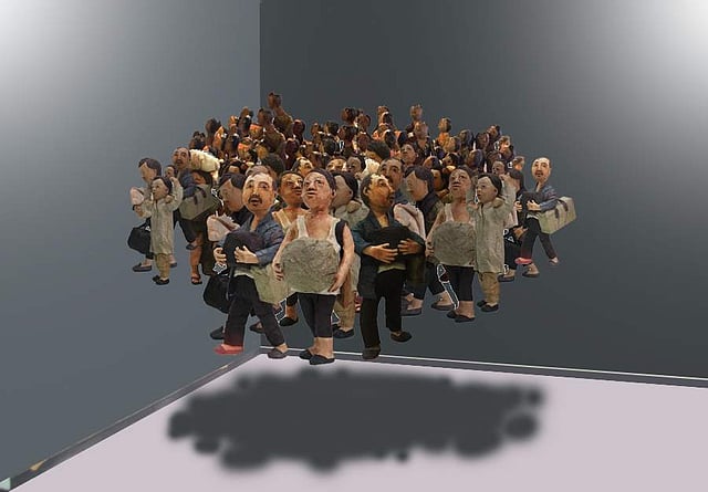 This emotional distress, connecting the refugees with me, has become a repository from where this work stems. My installation, creating an imagery of a clustered crowd of migrants, huddling together as a fearful, vulnerable bunch is an embodiment of the harsh wounds of migration and alienation. Their obtruding presence is a remark on the exclusion and bewilderment that the migrants face from a culture, which doesn’t consider them as one of their own.