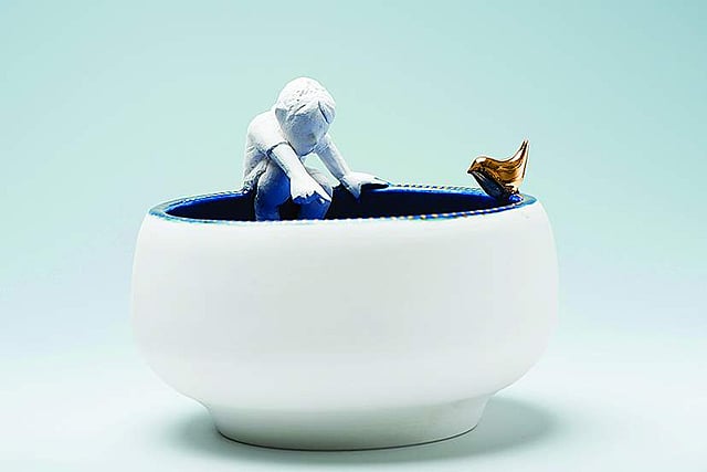 Many of the artists here hail from varied backgrounds in art, design, IT and other academia, notes the curator. In their hands, the form of the bowl becomes an “artistic three-dimensional canvas”, she says — one that is, “At times tantalisingly abstract, at other times, precise, geometrical, real, figurative, charming, and playful.”