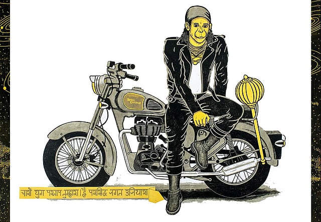 As an entity owning heroic acts, an icon for strength and speed, and as the ever faithful aide, Hanuman is deeply ingrained in Indian popular culture and has mass following. Champa portrays Hanuman through a multi-layered lens – looking at him physically, metaphorically, and at times through partial abstraction – building diverse moods and atmospheres through formal devices of colour, contour and scale.