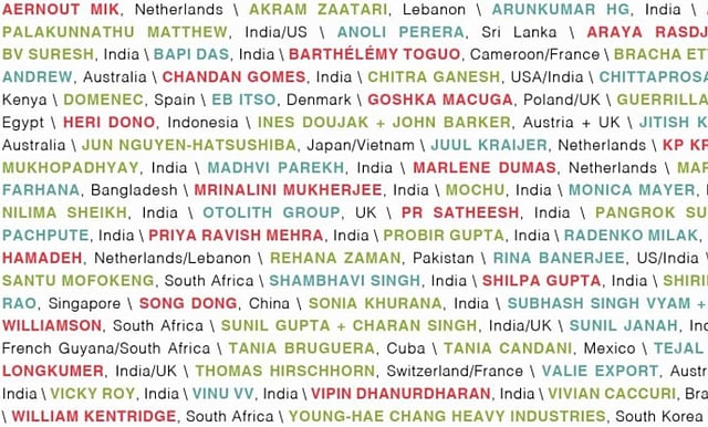 Aernout Mik (Netherlands), Akram Zaatari (Lebanon), Arunkumar HG (India), Anju Dodiya (India), Annu Palakunnathu Matthew (India/US), Anoli Perera (Sri Lanka), Araya Rasdjarmrearnsook (Thailand), BV Suresh (India), Bapi Das (India), Barthélémy Toguo (Cameroon/France), Bracha Ettinger (Israel/France), Brook Andrew (Australia), Chandan Gomes (India), Chitra Ganesh (USA/India), Chittaprosad (India), Dennis Muraguri (Kenya), Domenec (Spain), EB Itso (Denmark), Goshka Macuga (Poland/UK), Guerrilla Girls (USA), Hassan Khan (Egypt), Heri Dono (Indonesia), Ines Doujak + John Barker (Austria + UK), Jitish Kallat (India), Julie Gough (Australia), Jun Nguyen-Hatsushiba (Japan/Vietnam), Juul Kraijer (Netherlands), KP Krishnakumar (India), Kausik Mukhopadhyay (India), Madhvi Parekh (India), Marlene Dumas (Netherlands), Martha Rosler (USA), Marzia Farhana (Bangladesh), Mrinalini Mukherjee (India), Mochu (India), Monica Mayer (Mexico), Nathan Coley (UK), Nilima Sheikh (India), Otolith Group (UK), PR Satheesh (India), Pangrok Sulap (Malaysia), Prabhakar Pachpute (India), Priya Ravish Mehra (India), Probir Gupta (India), Radenko Milak (Bosnia and Herzegovina), Rana Hamadeh (Netherlands/Lebanon), Rehana Zaman (Pakistan), Rina Banerjee (US/India), Rula Halawani (Palestine), Santu Mofokeng (South Africa), Shambhavi Singh (India), Shilpa Gupta (India), Shirin Neshat (Iran/USA), Shubigi Rao (Singapore), Song Dong (China), Sonia Khurana (India), Subhash Singh Vyam + Durgabai Vyam (India), Sue Williamson (South Africa), Sunil Gupta + Charan Singh (India/UK), Sunil Janah (India), Tabita Rezaire (France/French Guyana/South Africa), Tania Bruguera (Cuba), Tania Candani (Mexico), Tejal Shah (India), Temsuyanger Longkumer (India/UK), Thomas Hirschhorn (Switzerland/France), VALIE EXPORT (Austria), Veda Thozhur Kolleri (India), Vicky Roy (India), Vinu VV (India), Vipin Dhanurdharan (India), Vivian Caccuri (Brazil), Walid Raad (Lebanon/USA), William Kentridge (South Africa), Young-Hae Chang Heavy Industries (South Korea), Zanele Muholi (South Africa)