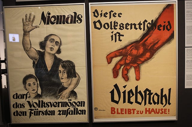 Among the 250 items on display at the German Historical Museum in Berlin are campaign posters highlighting the political debates of the era, from the fight for secular education to a debate over the expropriation of Germany's aristocracy.