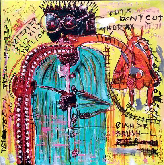 Most of his works are inspired by American artist Jean-Michel Basquiat and aims to arrive at an Indianised style of Basquiat’s works. He uses acrylic on canvas, to emote with vibrant colours, the day-to-day activities, incidents and situations that he experiences around himself.