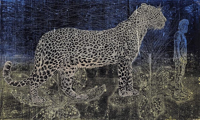 "The show is eponymous of Prathap Modi’s print that fuses the elements of the cosmic and terrestrial. Through the representation of a male figure and oversized animal, his works open metaphors of a space of fathomless time and place with the sonic effect of cosmic silence," says the note.