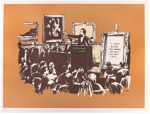 The sale is titled in homage to the artist’s Morons (Sepia) screenprint (2007, estimate: £12,000-18,000, illustrated above left), which parodies a photograph of the record-breaking Christie’s sale of Vincent van Gogh’s Sunflowers in 1987, with van Gogh’s canvas replaced by Banksy’s text.