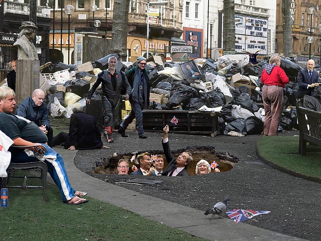 In the background, a mountain of garbage evokes Britain's 1978-1979 "winter of discontent", when rubbish went uncollected during strikes.