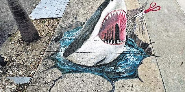 At the festival, Limnesh and Jincy made a 6X6ft image of a shark trapped in a fishing net. They painted pliers at the end of the net, with which passersby could rescue the shark if they wanted to. Titled Rescue Me, it is one of their latest interactive 3D works. “A little girl came to watch the painting and loved it. When I said she can rescue the shark by putting her hands near the pliers, she was shocked. ‘Sharks are bad, why should we rescue them,’ she asked. By then, around 14-20 people gathered around, explaining to her why it’s important to save sharks. That day, more than 10 people learnt a little about ocean conservation,” says Limnesh.