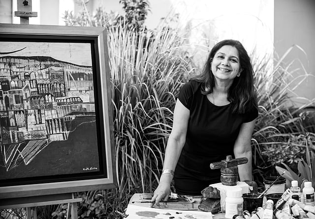 It is simple to fall into a mood of quietude while studying Vinita Karim's paintings, but the fundamentals of her artwork remain shaped by landscape and history and the ways they influence the life around us. Reclining in her settee, Vinita tells us that she feels like a 'world citizen'. With a notable homage to the ancient Kalamkari hand painting style, which involves applying tamarind ink to cotton or silk fabric, Vinita’s artwork is both densely nuanced and personal. She has recently worked with talented local artisans to embellish her cityscape paintings with pieces of elaborate embroidery, lending them depth. Kalakriti will be showcasing her upcoming solo art show, Timeless, on December 11.