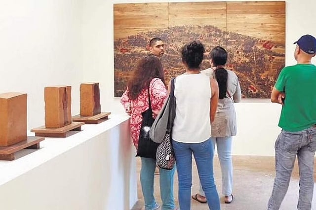 Saju’s work brings to life his village in Palakkad. The main installation includes images of his ancestral home and an aerial Google Maps view of the village printed on teakwood. Another one has earthen bricks on which the images of his ancestors have been printed.