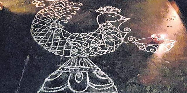 The ritual began with bali (offerings) that the olden agrarian society would offer to the Gods before beginning their days. “People did this in households, and commercial practices. Paddy was one such offering. This continued for years. Around the 6th-9th century, the bali of paddy slowly transformed into the kolam that we see now. So, the picture of one sweeping the floor, pouring water, waxing it with cow dung, and then placing the kolam, is evident as far back as the 9th century,” she notes.