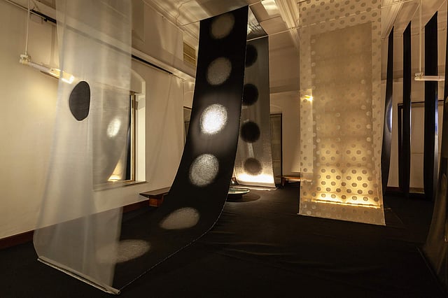 The entire panel was woven initially as a sample that was one-fourth the size of the actual work, only when Jayashree was confident about it, the final work was made. The main challenge that the artist faced was how the installation would interact with the space. Despite the challenges she has faced, Jayashree has been successful in creating an installation that is intriguing. The works are suspended from the ceiling and give visitors a chance to interact with them while walking around the space.