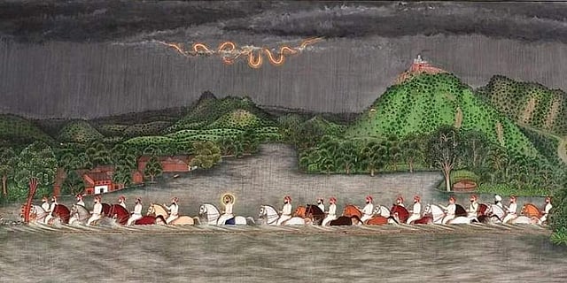 It is pouring. The sky above and the river below emerging out of a submerged green valley have turned various shades of grey. The fiery orange lightning in the sky turns monstrous by the moment, as the king’s convoy of horses tries to get across the flooding river. The large-scale 19th-century watercolour painting, titled ‘Maharana Fateh Singh crossing a river during monsoon’, once exhibited in the courts of the Udaipur Palace, will now adorn the walls of the Smithsonian’s National Museum of Asian Art (NMAA) in Washington DC, beginning November 19.