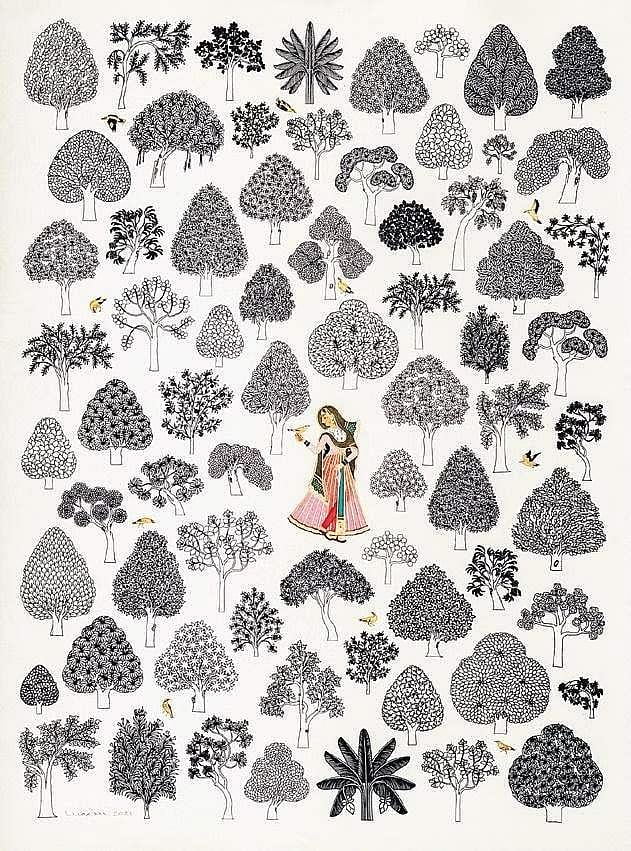 His colourful wall paintings of the Meena women, featuring the oral traditions of the agrarian and nomadic communities in the region, done in the traditional Kota-bundi miniature style are replete with motifs borrowed from nature, manifesting in the form of maps and lines.