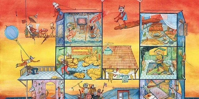 In the stunning wash and gouache on paper series, ‘Are We Ready For Tomorrow’s Sun’, Yogesh Ramakrishnan transforms the home into a theatre with human beings wearing masks. It’s his satire on life as we know it now. “This painting visualises a series of short plays about surviving the lockdown and people finding entertainment at home. I treat each house as a theatre space, by imagining how behaviour changes inside after hearing or reading about new developments outside; therefore the question “are we ready for tomorrow’s sun?” elaborates the Pune-based artist.