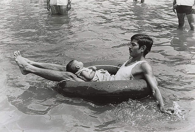 Another poignant moment captured in Flash Floods showcases a father cradling his infant on a floating tube — an intimate snapshot amidst the disaster’s aftermath. School for the Blind captures the camaraderie of two blind kids with the biggest smiles we’ve seen while the reflection of a dancer applying lipstick in the mirror and a candid moment between actors on a movie set are some of Satyan’s masterful compositions of freezing frames to offer us a glimpse into lives lived fully. Amidst this dynamic movement, a select few deliberately pose — a testament to Satyan’s capacity to balance the candid with the composed.