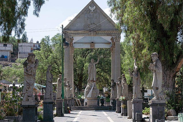 The village cemetery is filled with yard-high (meter-high) statues of saints and a knot of men who coax flower garlands and flowers out of the blocks of stone with their chisels. Generations of stone carvers in Chimalhuacan, on Mexico’s City’s far east side, also created much of the stonework that adorns buildings and parks in the capital’s downtown.