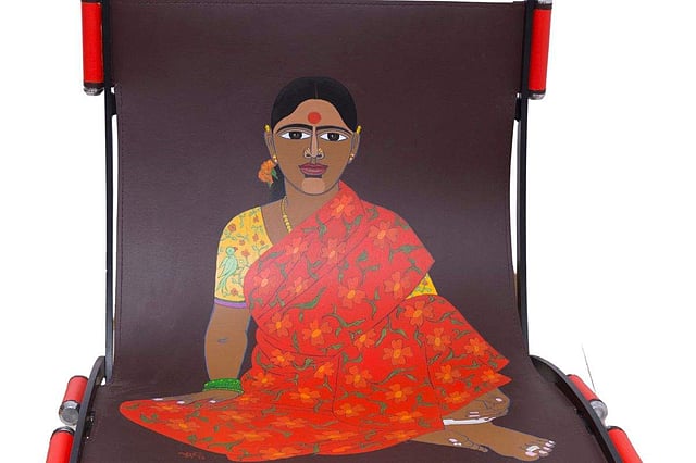 Art and Craft part of the exhibition include, beautifully painted chairs by Asit Patnaik from Delhi and Chippa Sudhakar from Hyderabad. Nagesh Goud’s wooden flakes on an iron pot almost look like inlay work. Laxman Aelay’s leather chairs have Poolammas sitting on them like queens. There is the same quirky humour in Rajeswar’s handcrafted box that shows a woman’s innate love for jewellery and the narcissism involved. Ramesh Gorjala has sent an old vegetable slicer or Kathi Peeta in Telugu and transformed it into an object of great beauty.