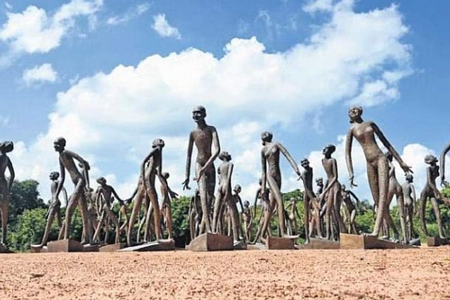 For now, sculptor KS Radhakrishnan is in the Bronze Age. At his first-ever retrospective, the front lawn of Delhi’s Bikaner House is populated by a horde of ‘bronze people’, caught in motion. Named The Crowd, the massive installation of 50 figures, each six feet tall, brings to mind Polish artist Magdalena Abakanowicz’s fibre works. While both depict people frozen in time, Abakanowicz’s works are regimental compared to the effortless fluidity in Radhakrishnan’s figures. The space between the figures invites the viewer to step into a surreal dimension, and be one with the crowd. The exhibition, On the Open Road, mounted by Gallerie Nvya, covers five decades of the Delhi-based artist’s work.