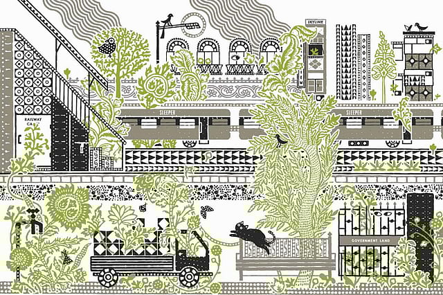 Henning Wagenbreth is a graphic designer and illustrator from Germany. He worked as a professor of visual communication and also pursued his interest in film and theatre. The artist takes inspiration from faces, sounds, smells and views that attract him and India provides him with a “visual rush”. For this project, he started by sketching things that he saw on the streets of Chennai and then tried to arrange them into patterns. He further complemented these patterns with an image and text. His fascination towards patterns also gives him the joy of reading patterns like music. It can be noticed that every pair of lines in the design talks about “travelling” in different contexts and meanings. While reading these texts may bring a smile on your face, a deeper analysis reveals an irony that makes one think and wonder.