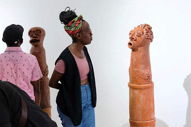 Nabulime’s show, which has attracted audiences for its conspiratorial take on the peculiarities of urban “gossip,” might never have happened if she hadn’t approached Xenson Art Space and asked for the opportunity to exhibit her work. Her work includes terracotta works topped with the deformed facial features of gossip bearers.