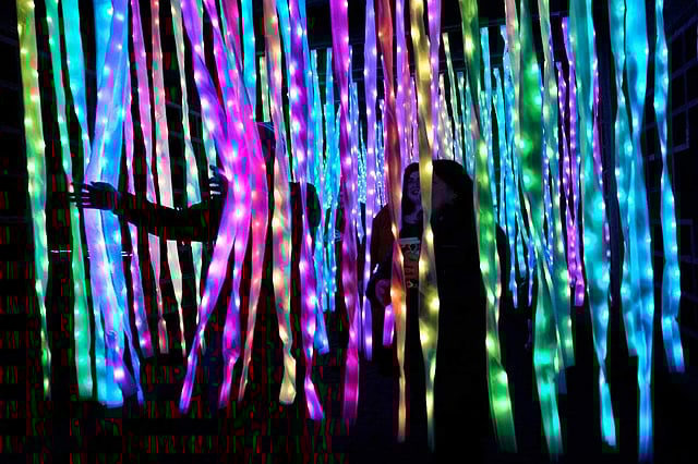 Highlights of the experience include passing through the “Electric Ribbon Tunnel” created by Culture Creative; “Sea of Light," created by UK artist Ithaca, which has 4,800 individually controlled balls of LED light; “Lilies,” by UK artist Jigantics, with 22 illuminated 5-foot (1.5-meter) lilies that float in and around the darkness of the Great Basin; and “Laser Lake,” projecting a rainbow of light dancing across the Great Basin.
