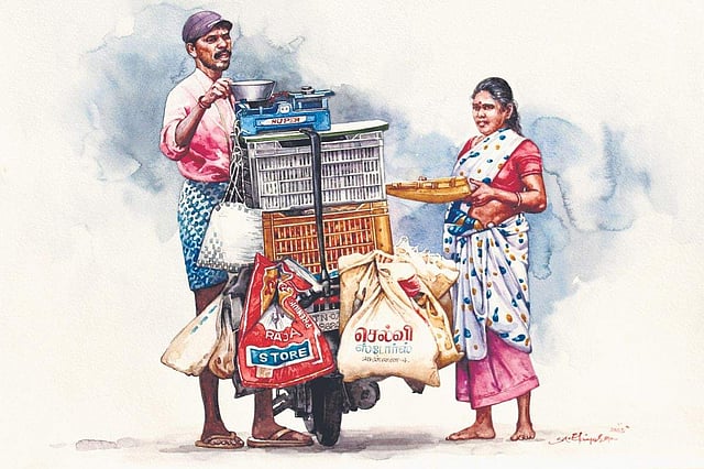 language in his paintings are the distinct features, a skill he has honed through experience. The minute details on clothes, their proportions and forms have all been carefully given shape. “I have used water colour as the medium to portray the cultural glimpses of both urban and village lives. I don’t have drama in my art; I just document glimpses of the culture in day-to-day life in Tamil Nadu and the other parts of India, with utmost honesty,” says Elaiyaraja.