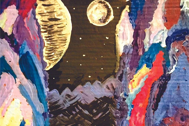 Her love for natural landscapes makes her explore blue and green as the most used colours in her palette. However, what piqued our interest the most was the response we got when we asked her about the materials she uses for painting. “Tea bags, coffee, salt, acrylics, cardboard, canvas, watercolours, and — last but not the least — cat and dog fur, because my furry family is also a collaborator,” she smiled, concluding the conversation.