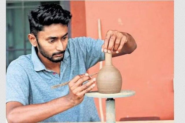 On the banks of the Eroor Canal, amid the serene evening breeze, Yadhu Krishnan is teaching a pupil the art of pottery. He shows her just the right angle to carve designs on her first terracotta creation. A successful, however rustic, flower vase. A beautiful maiden effort.