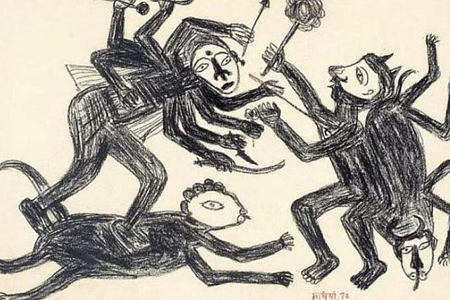 Parekh’s five canvases on display at Agradoot: Agents of Change, curated by art historian Alka Pande at Art Alive Gallery, depict the folk and Shakti imagery she is known for. Broota has stayed true to her geometric abstractionism, working with wool and thread for her four pieces in the show. Parekh delves deep into the Gujarati embroidery styles, while her contemporary work speaks through intertwined threads of the chaos and beauty that gives her city its character. Their colour schemes are polar opposites. Broota uses bold hues—purple and blue being prominent—Parekh has a subdued palette: there are two monochromatic charcoal pieces. Both have held numerous exhibitions across the world, but this is the first time their works appear together. The show is a tour de force through the creative imaginations of 11 women artists, and the role they play in society.