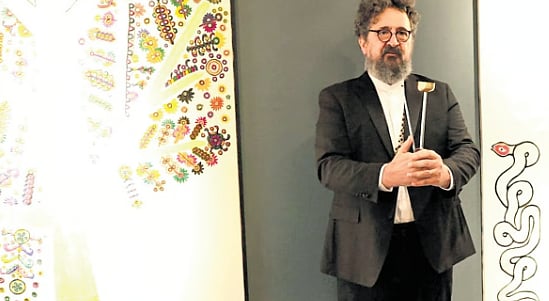The universal concept of borderless-ness attracted him first to Indian tribal artists with whom he collaborates. “We all aspire to union and freedom,” he speculates. Till date, he has worked with over 25 traditional Indian art forms. It took over two decades and such collaborations to finish his present exhibition. What was the process like? “Working with indigenous artists evokes a strong emotion, because they remind me how the centre of my being is in the heart, not in the mind.
