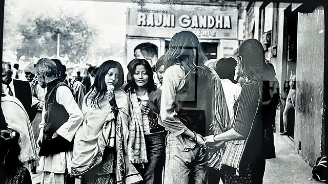 A monochrome photograph from the archives of the shop captured guitarist George Harrison playing a sitar from the shop’s collection — a cedar wood sitar from the shop’s collection crowns a pedestal at the exhibit to mark that history. The visit brought a surge of tourists leading to the boom of hotels, restaurants, and nightclubs, introducing the area to hippie culture. Photographer Pablo Bartholomew trained his lens on the cultural mood with a photograph captioned, “A hippy couple walks hand in hand near Regal Cinema in CP in 1974” where the Eastern world was meeting Western influences; the couple in the photograph sported braided hair, and Indo-western outfits paired with a printed sling bag.