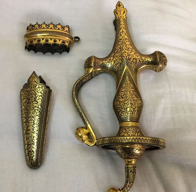 The origins of koftgiri can be traced back to the medieval period, where it flourished under the patronage of Rajput rulers and Mughal emperors. Rajasthan, known for its rich traditions of warfare and artistry, provided an ideal setting for the development of this craft. The decorated weapons served as more than just tools of war; they were also expressions of power, sophistication and a deep appreciation for art. The craft reached its zenith during the Mughal era, where it became a hallmark of royal weaponry and ceremonial objects.