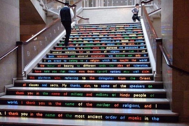 More than 120 years ago, Swami Vivekananda's words at the Parliament of the World's Religions received a standing ovation. Today, his words are etched in the same location at The Art Institute of Chicago. Mumbai-based artist Jitish Kallat designed a groundbreaking installation at the historical staircase of the institute. The world was his canvas and he got creative with his paintbrush. The installation is a beacon of hope to the lost and peace to the troubled.
