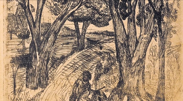 Bichitra Club, an intellectual and artistic club founded by the Tagores in 1915, elevated printmaking beyond mere reproduction to an art form in its own right. The Tagore brothers—Abanindranath, Gaganendranath, and Samarendranath—alongside their uncle Rabindranath Tagore, converted a section of their Jorasanko residence into a hub for artistic discourse and experimentation. Mukul Dey’s depiction of Tagore Lane, using the dry point etching technique acquired under printmakers such as James Blanding Sloan in London, evokes a vista from Jorasanko. During his time at the Bichitra Club, Dey persuaded Rabindranath Tagore to experiment with the medium, resulting in Tagore’s prints—both etchings and lithographs—displayed in the exhibition.