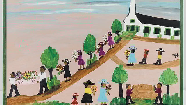 Clementine Hunter grew up on Louisiana plantation and became an acclaimed self-taught artist. Starting in her 50s, she created a visual history of everyday life there — from laundry days to weekend parties — as she remembered it in the early 1900s. Two of her untitled works are in the exhibition; one shows people gathering at an outdoor funeral, while the other depicts a courtroom scene.