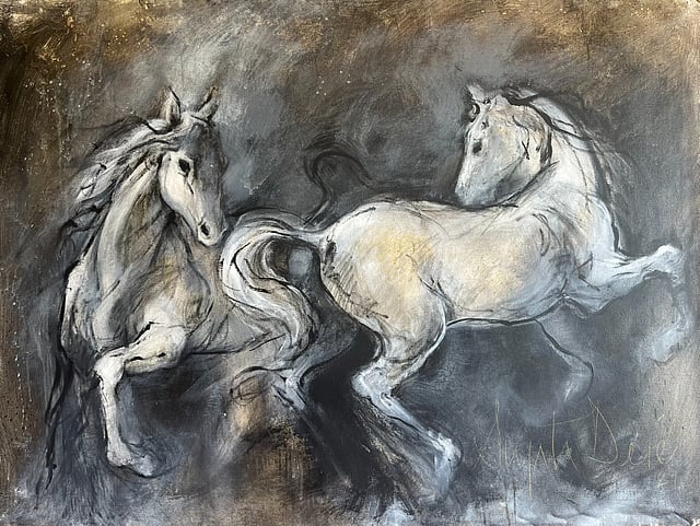 “I love to use earth colours while painting horses. I play with thick and thin lines, using a brush in a gestural way, sometimes dipping my fingers in paint and working directly on the surface building up the energy of the horse. I seldom erase,” she adds.