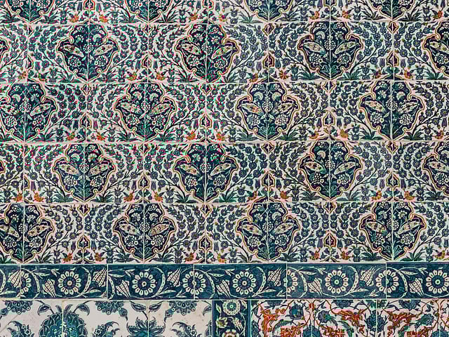 The production of Iznik tiles involves a meticulous, multi-step process that requires exceptional skill. The base material is a fine, quartz-rich clay known as fritware, which gives the tiles their signature white, glassy appearance. The clay is shaped, dried and then coated with a thin layer of white slip. Artisans then hand-paint the intricate designs using natural pigments. After painting, the tiles are coated with a transparent glaze and fired at high temperatures, typically around 900-1000°C, which fuses the colours and glaze, giving the tiles a glossy finish and durability.