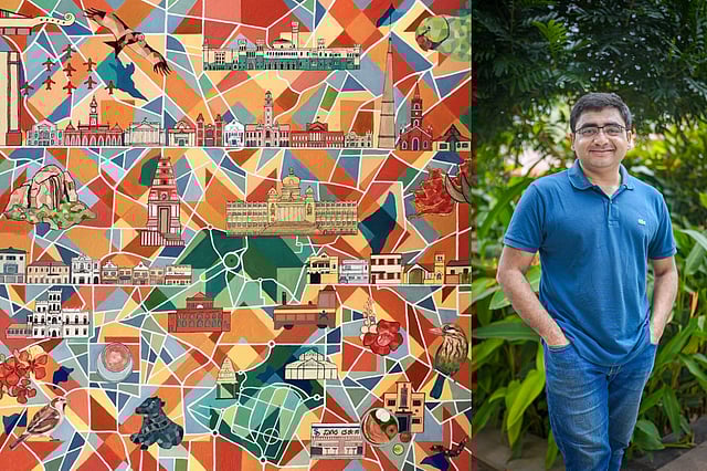 Using the unconventional yet expressive angle of the bird’s eye, Santosh reimagines the essence of ’90s Bengaluru in its entirety. He showcases various landmarks and neighbourhoods on a single canvas in these artworks with the use of geometric lines and figures guiding the eye through the various neighbourhoods. In our conversation with Santosh, we further understand how this signature style arrived to him, how he honed it further, what makes such artworks special, what his transition from a management consultant to a painter was like and lots more.