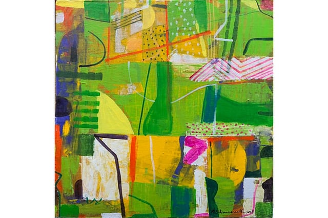 The exhibition features 27 abstract paintings—either acrylic on canvas or mixed media on wood—created over a period of three years. “Abstract Contemplations is a genuine expression of my experiences with the environment and society around me,” the artist tells us.