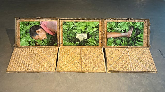Another artist with an unconventional approach is Hari Katragadda, who has created cyanotypes using Ganga water over a 24-hour period, producing a grid of 24 cyanotypes that reflect each hour. He explains, “Cyanotypes are made using distilled water and chemicals, but I use the contaminated water and pollutants in the Ganga river and utilize this glitch in the cyanotype process to produce art.”