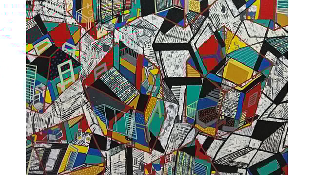 It was interesting to see how the artworks have incorporated more circular boundaries than his earlier symmetrical ones. When asked about it he says, “It wasn’t a deliberate shift, but rather an organic evolution. I found the round format liberating—it allowed me and the viewer to embark on a more open, intuitive visual journey. Circles softened the spatial rigidity I was used to and introduced a new rhythm—one that felt cyclical, eternal and meditative. It became less about structure and more about flow. In many ways, this shift marked my transition from a mapper of space to a narrator of movement and time.”