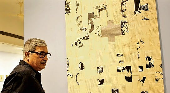 For the 64-year-old artist, who was trained at Rabindra Bharati University in Kolkata under noted printmaker Pinaki Baura (1954-2021), the world exists in layers of grey, from the deepest charcoal to a steely sheen. This vision manifests through the application of graphite powder on paper. Within the depths of grey, this industrial product occasionally sparkles. It is difficult to “read” his work, though. It could constitute scraps from his earlier work that he destroyed in a fit of frustration, or even pages of legal documents, in particular, his challenge to a university authority for “unjustifiably” sacking him. Basu had joined Rabindra Bharati University as a visiting professor. His teacher Pinaki Barua decided to leave RBU and join Visva Bharati. Basu was interviewed for the post and he joined. Over a year later, Basu was entitled to fill in Barua’s post, going by precedent. But he was denied the post. So he went to court against RBU. Till now the case hasn’t been closed.