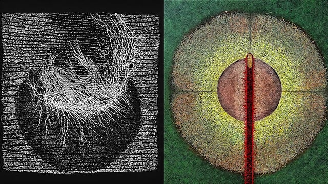 Her work, Brahm, a black and white mixed media piece featuring individual white strokes forming a circle across a black figure, represents the idea of "utpati," the origin of the world, which can be translated as the origin of our inner selves. Most of her works remain unnamed, as she believes the canvas will reveal its title to everyone who stands before her painting and observes it. What we see and take away from each of her canvases is unique to each individual and a name cannot encompass the various meanings behind each work.
