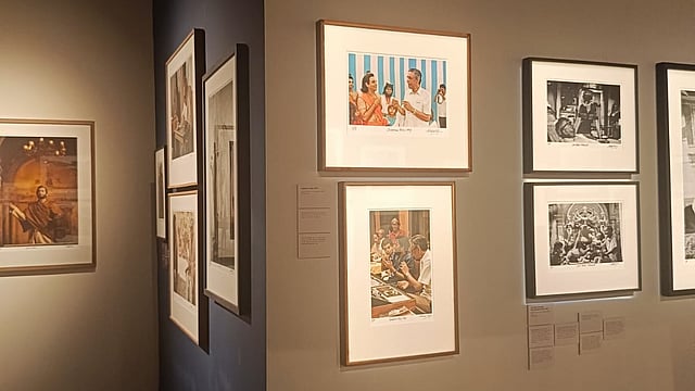 What attracts people from the moment you enter the exhibition are the OG BTS visuals. Nemai Ghosh captured these snippets from his lens when neither OG nor BTS were a thing. Where in one frame you can see Sharmila Tagore sitting in a beauty parlour getting groomed on her off day in sets, another frame captures Manik Da (Satyajit Ray) and Soumita Chatterjee where the latter is dressed as Lord Ram. One momentary glimpse of Amjad Khan from the twirls of the hookah pipes to an enigmatic dim light capture of Victor Banerjee and Swatilekha Sengupta, are photographs not to be missed.