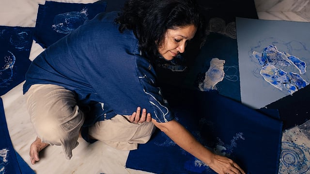 Apart from the theme what strikes the audience while viewing the display is the wide use of India’s traditional artistic process of Indigo vat dyeing. Often referred to as the ‘blue gold’, the use of indigo in art or crafts dates back to the Indus Valley Civilization. The use of Indigo, which according to the artist is a legacy that needs constant nurture resonates perfectly with relationships, which are also built on the foundation of legacy and needs constant nurture with changing times. Radhika uses the past and the present to weave through futuristic art.